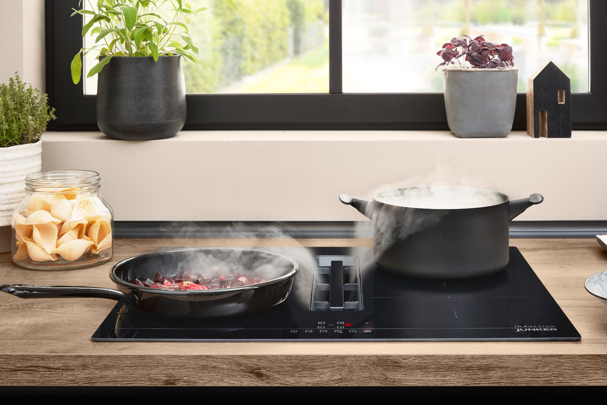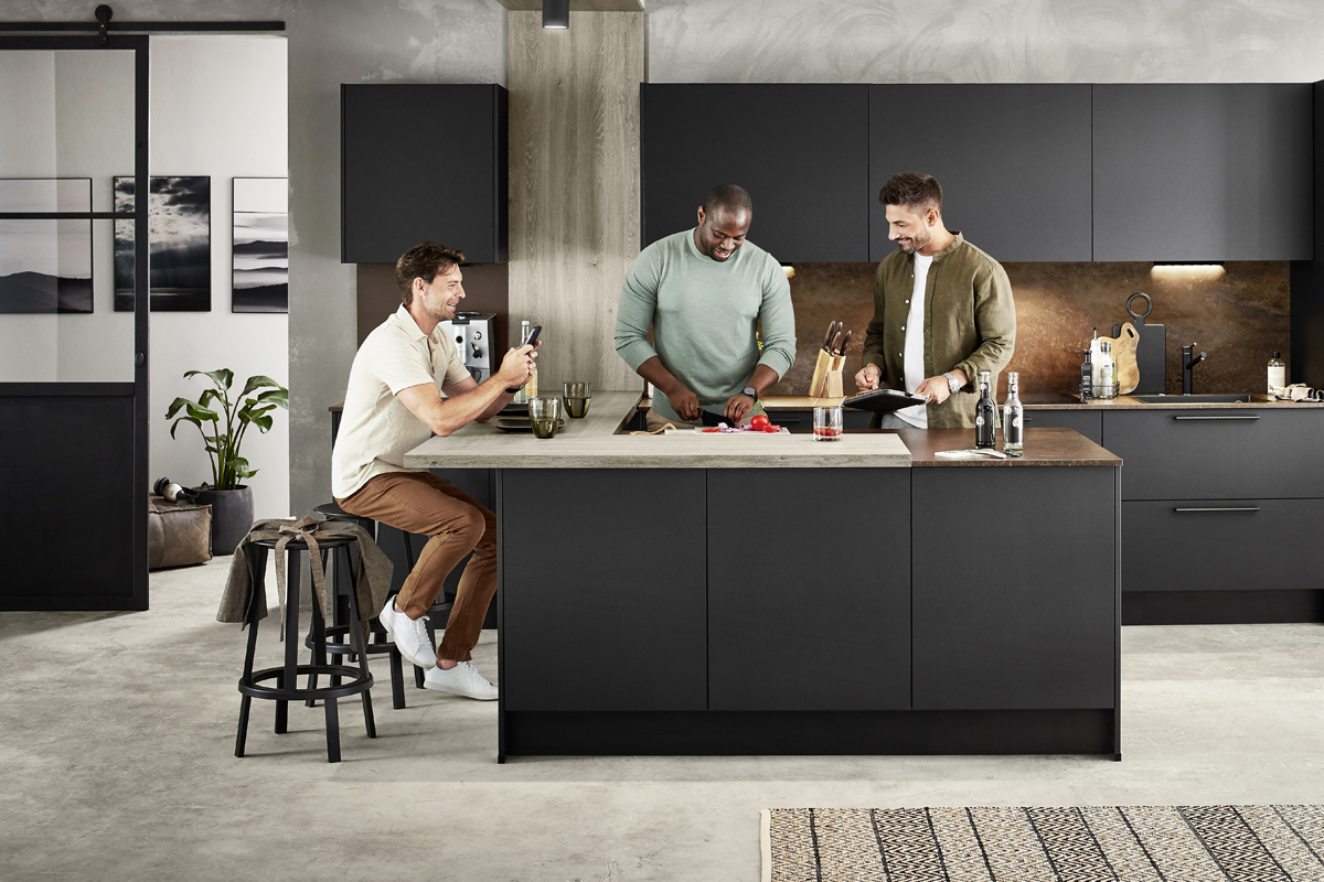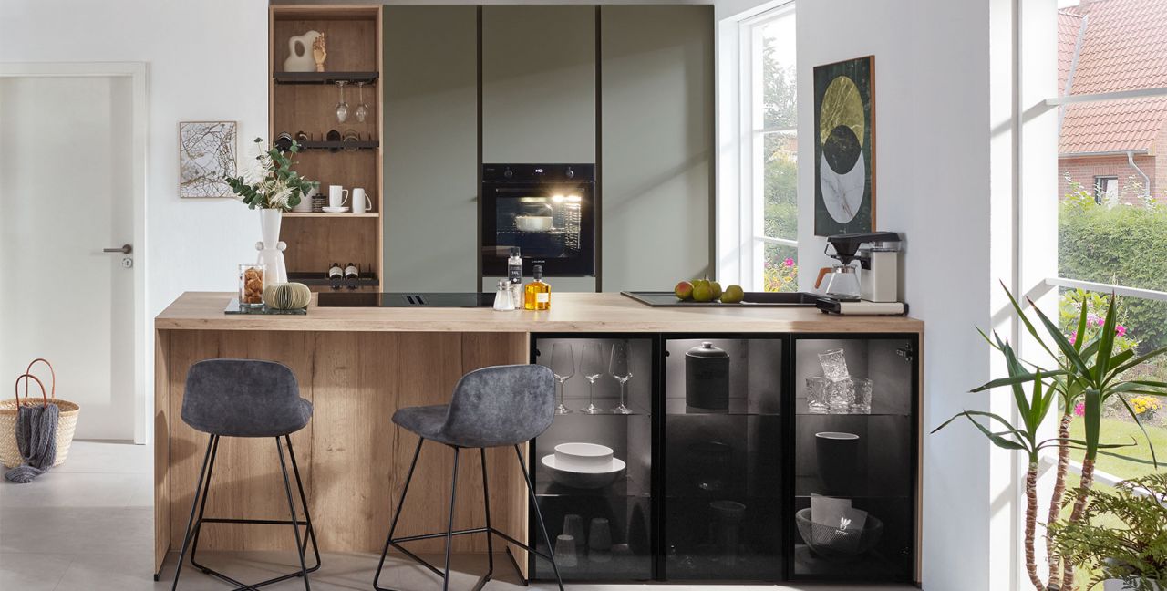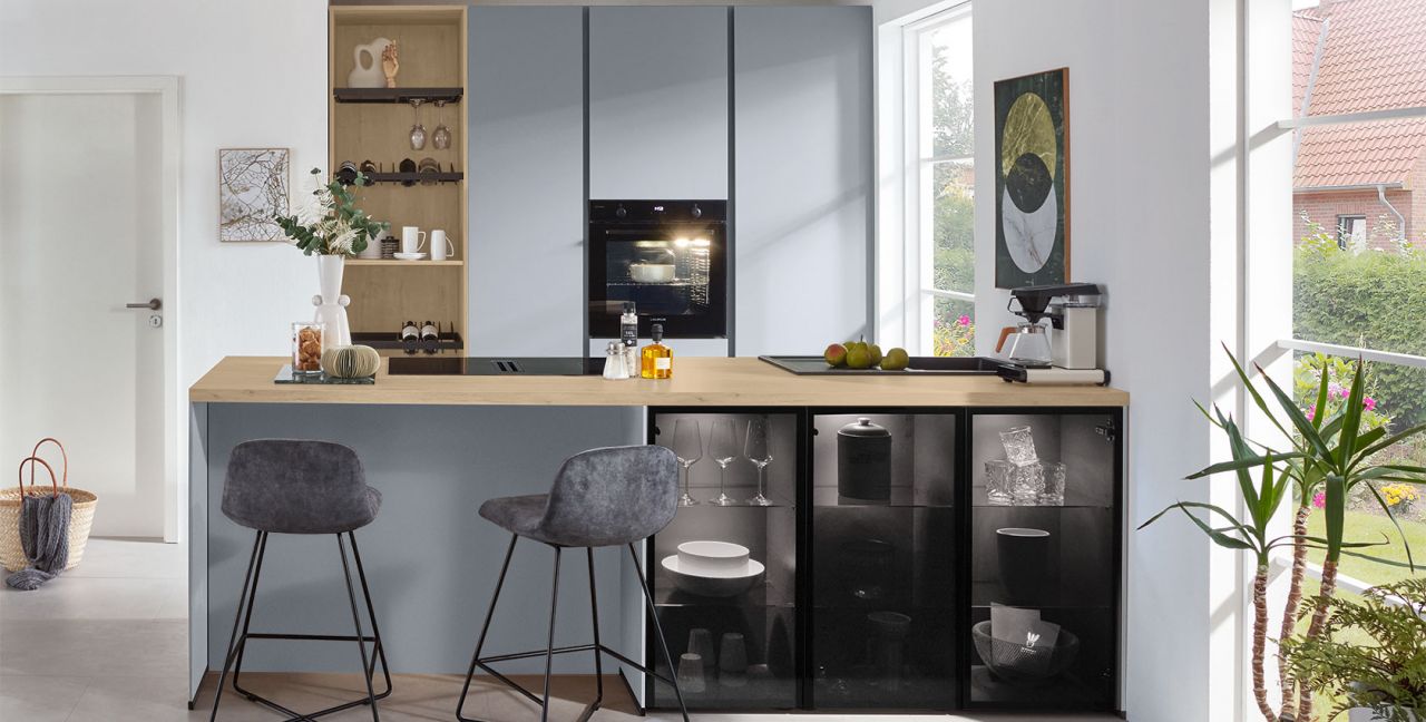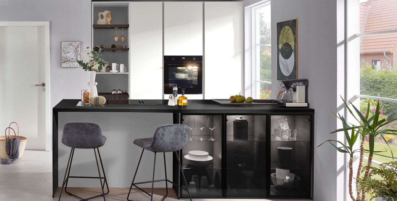 Inclusief inbouwoven Laurus LEB10BK Energieklasse A, keramische kookplaat met inductie en werkbladafzuiging (circulatielucht) Xtra Hob XTRAVENT373F80, koel-vriescombinatie Laurus LKG178E NF Energieklasse E, inbouw-designspoelbak Elleci Logik 300, XL-kasten, onderkasten met grote laden, wandkasten met Flat-glasdeuren, hoge kastplank, eetbar.